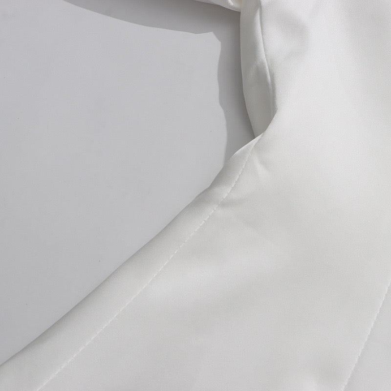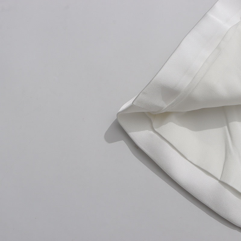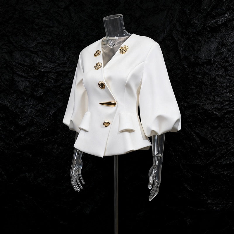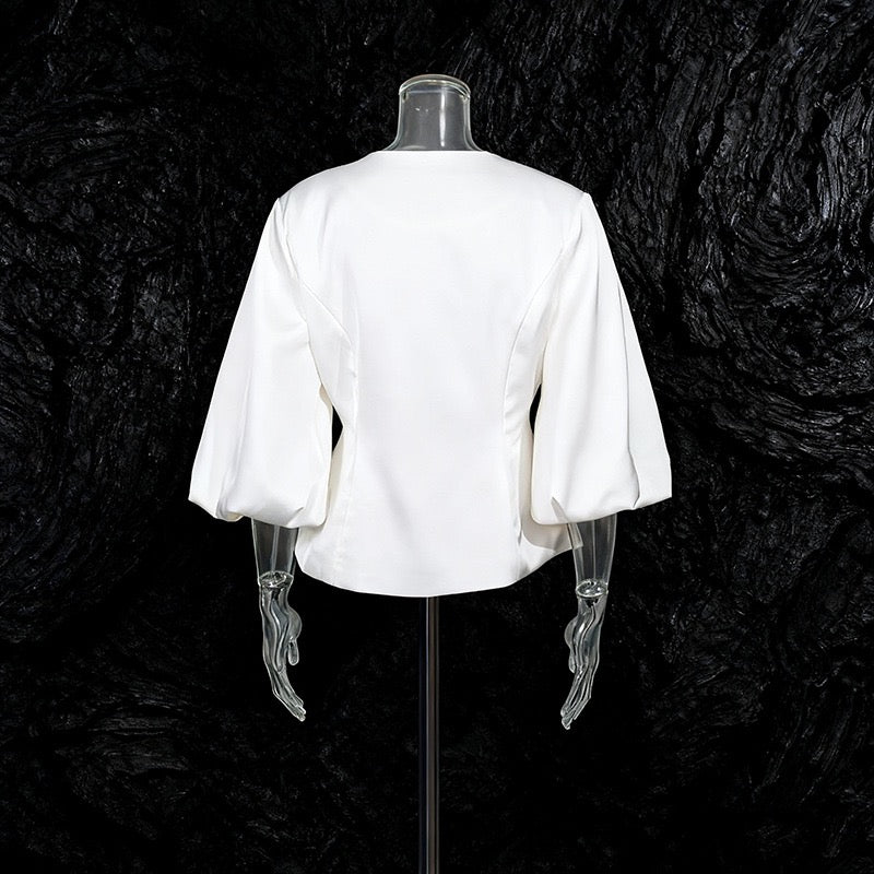 The voluminous three-quarter sleeves complete its modern, luxurious silhouette.