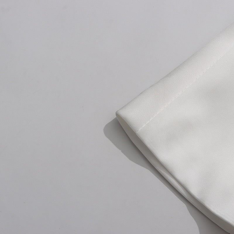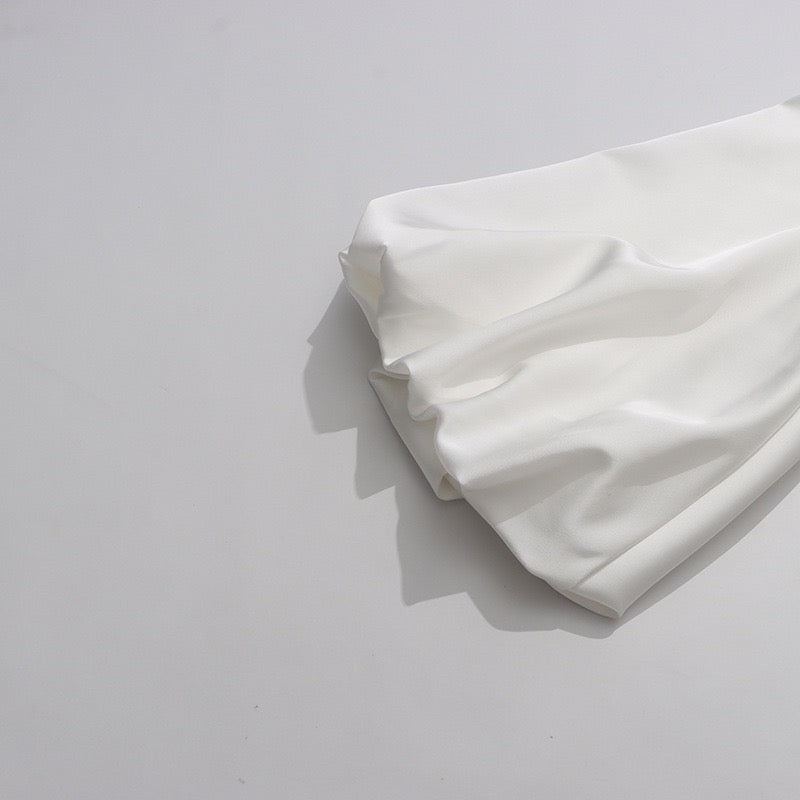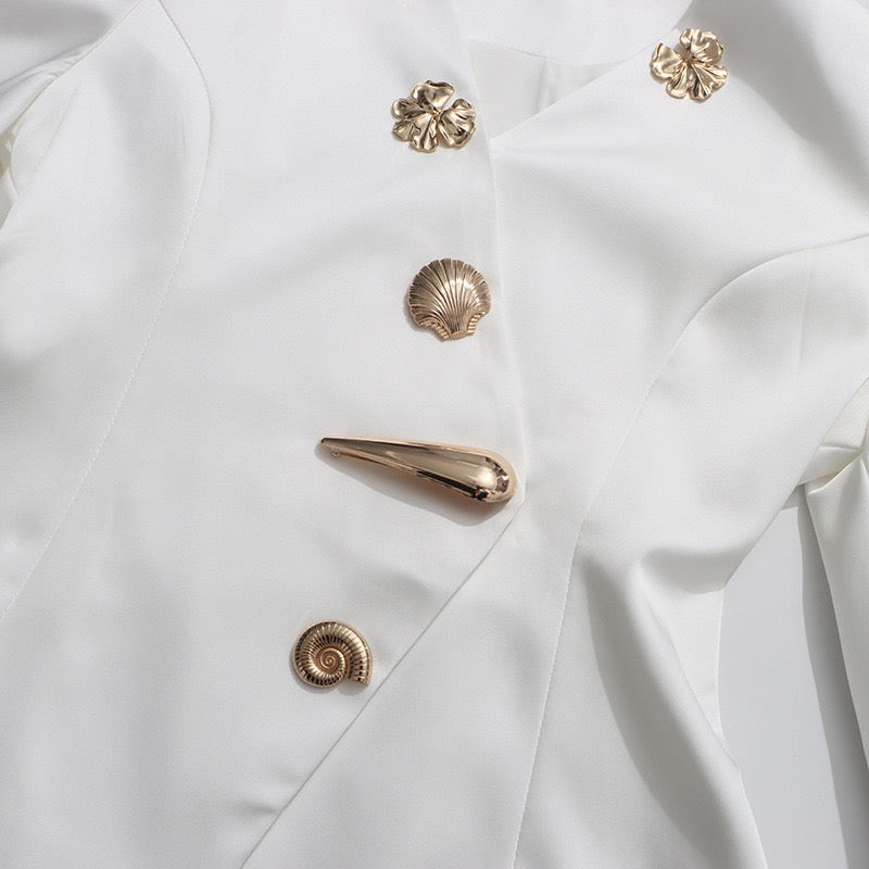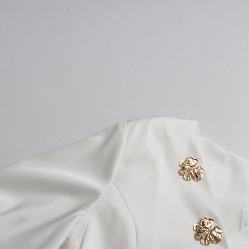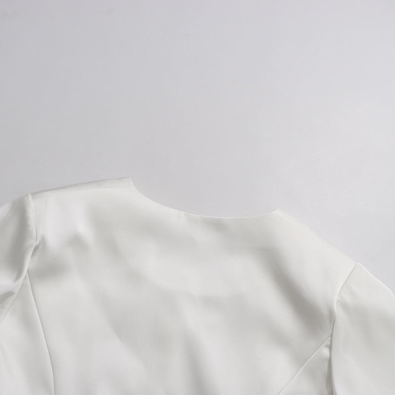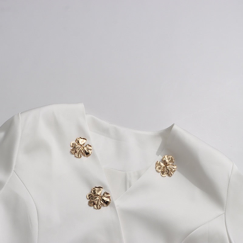 An elegant satin blouse featuring an asymmetric wrap-style front and deep V-neckline. The cinched waist creates a defined peplum shape, while gold-toned floral accents and a sculptural waist clasp add a luxurious touch.
