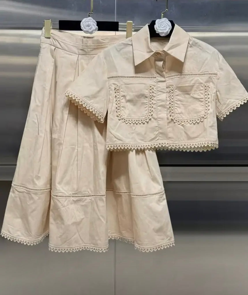 This stylish ensemble features a lapel short-sleeve top with a unique spliced design and convenient pockets, along with a high-waisted skirt for a flattering silhouette. The single-breasted closure adds a touch of sophistication to this chic outfit. Perfect for a day out or a casual evening event, this set is a must-have for any fashion-forward woman.