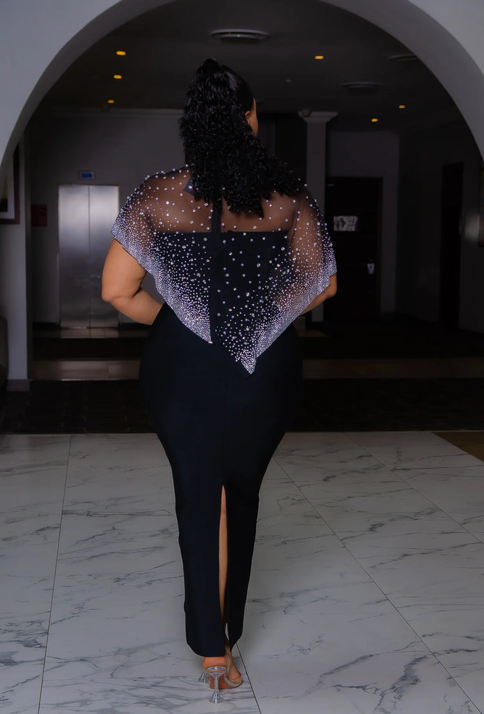 * Mesh asymmetric cape is embellished with 3D Pearls and Gemstones