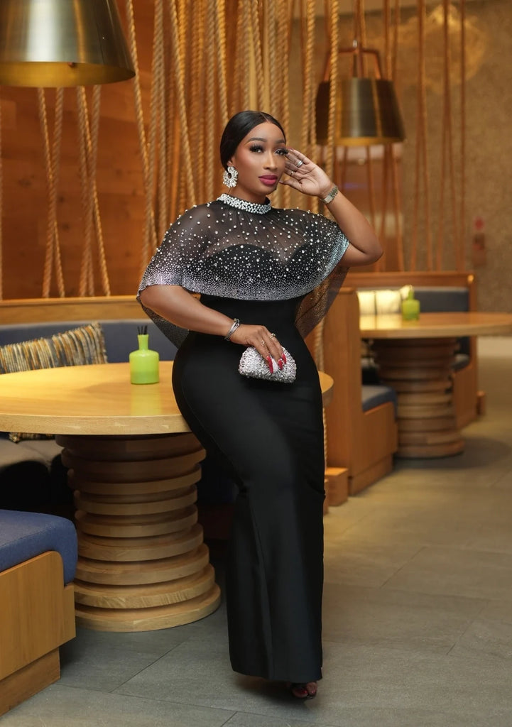 * Embellished with sparkle gemstones and pearls intricately arranged all over the Mesh cape