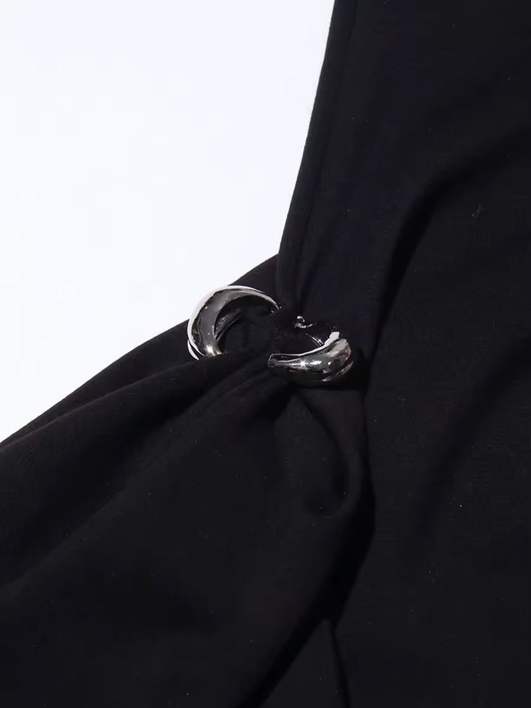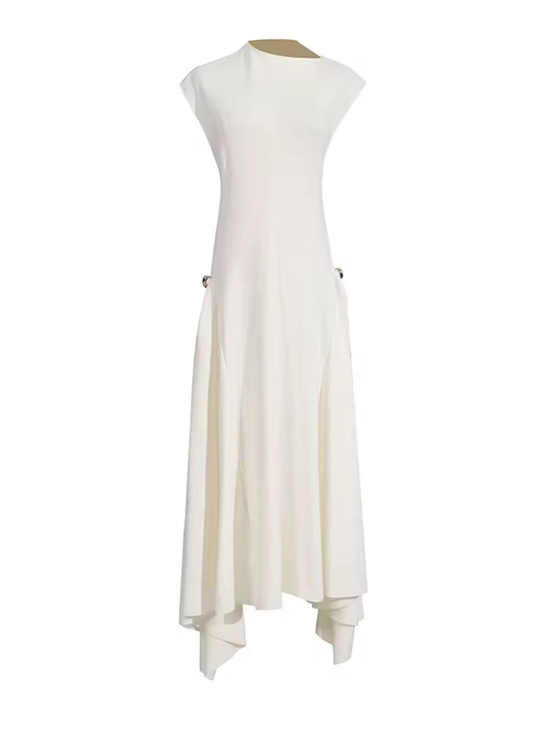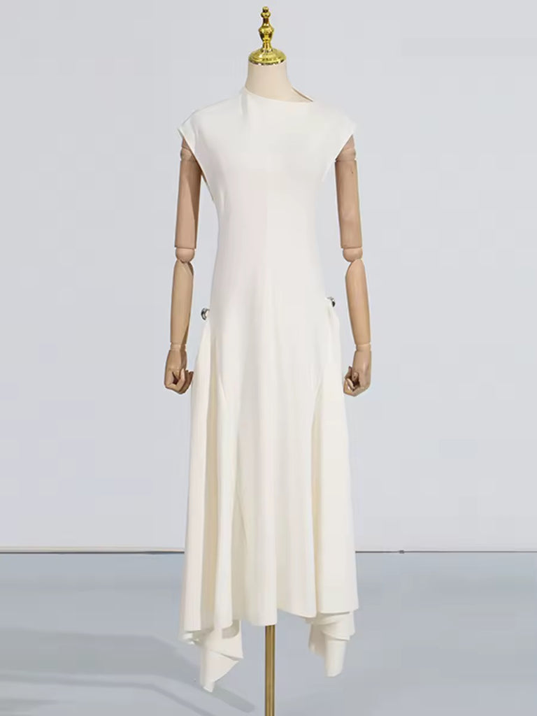 Make an unforgettable statement in this sleeveless A-line fit and flare midi dress, crafted to accentuate your figure with sophisticated flair. The asymmetric hemline adds a modern twist, while the delicately ruched hips sculpt your silhouette to perfection. Elevating the design are dual statement brooch pins on each side of the hip—offering a touch of glam that sets this piece apart.