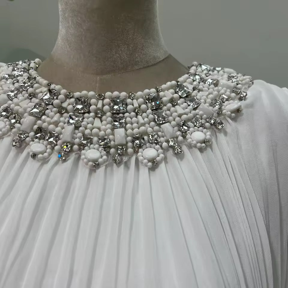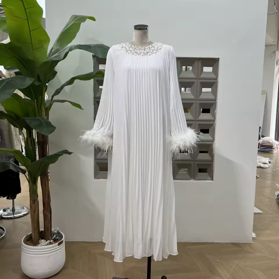 Plisse maxi dress with a must have neckline that brings luxury at an affordable price.