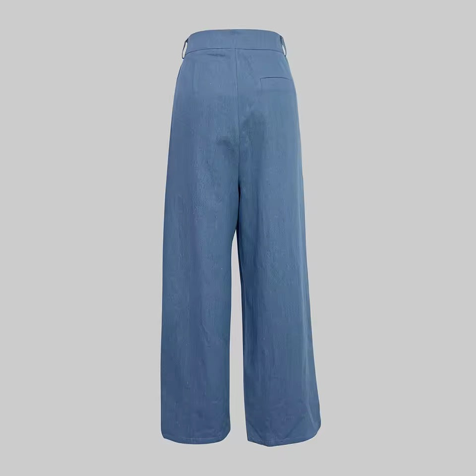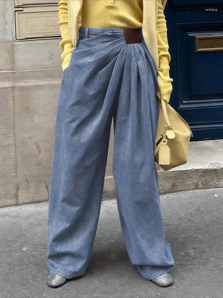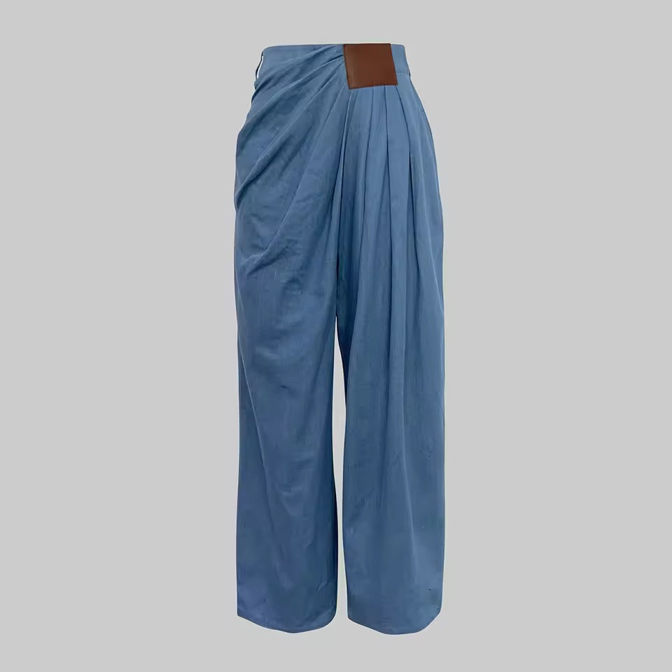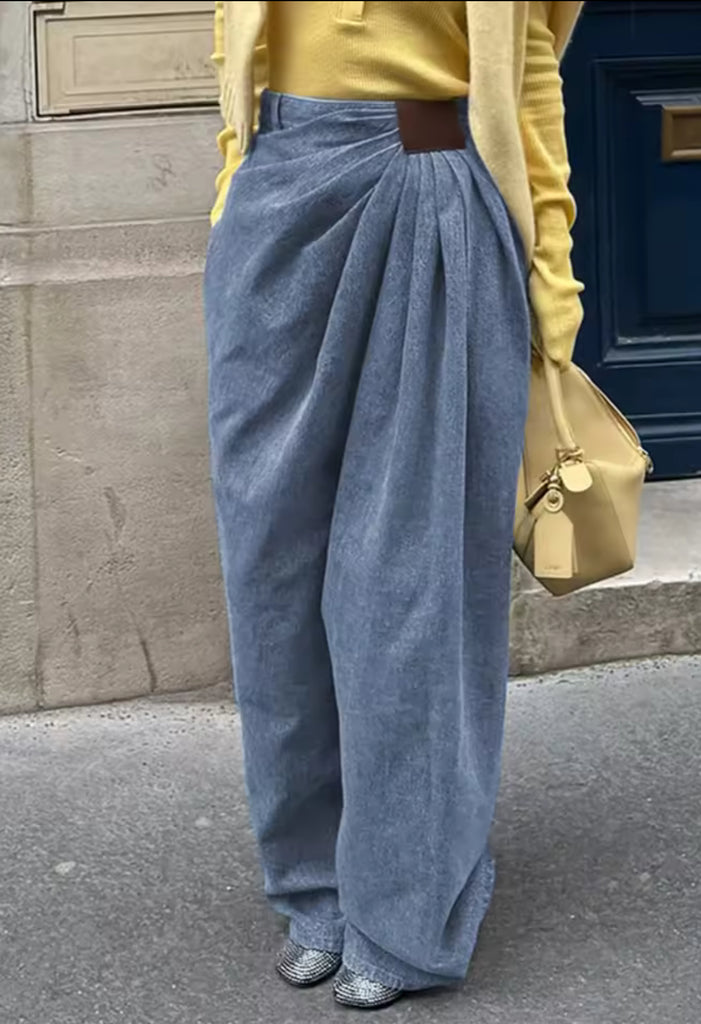 Gorgeous soft denim asymmetrical draped pants giving style and glass without breaking the bank.